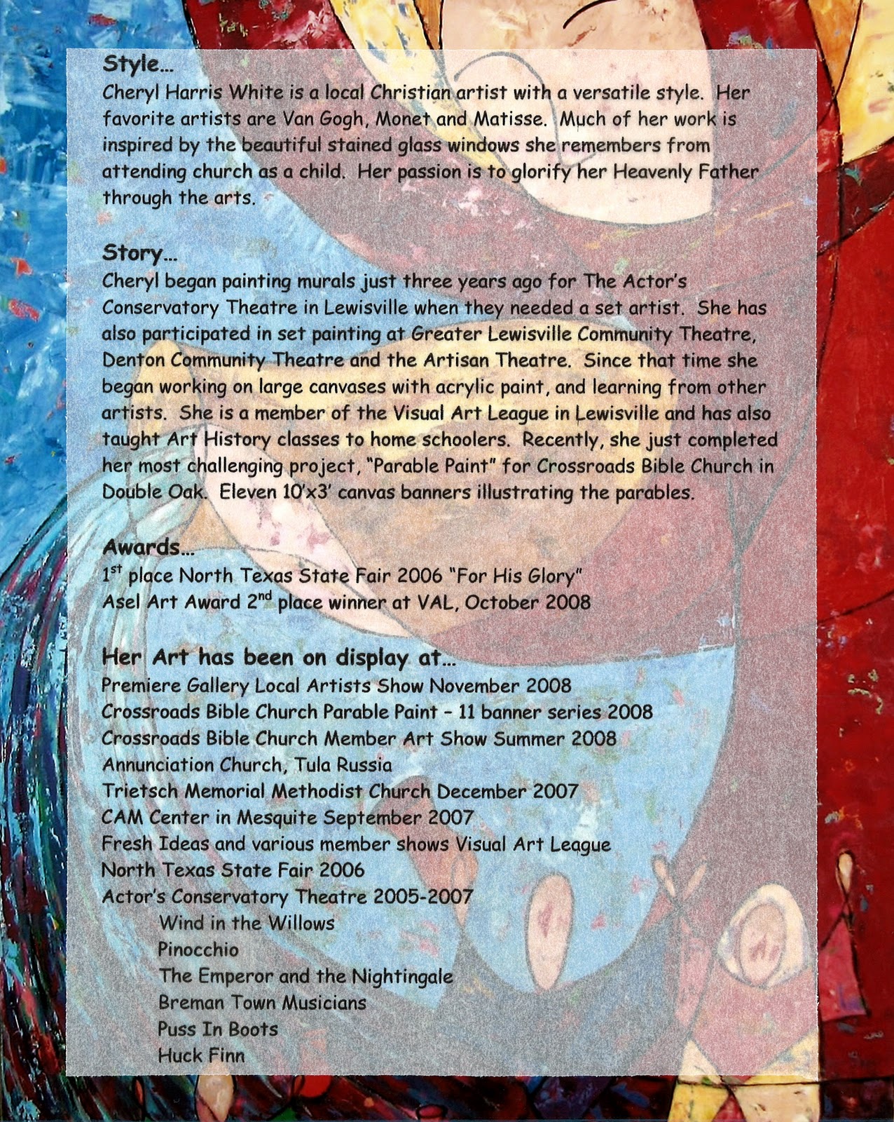 In 2008, I began to paint large canvases mostly with acrylic paint and to explore the use of stained glass imagery to bring Parables to life on canvas. During this time I also became a member of the Visual Art League in Lewisville, taking classes, participating in workshops and art shows, and learning from experienced artists in the community.
